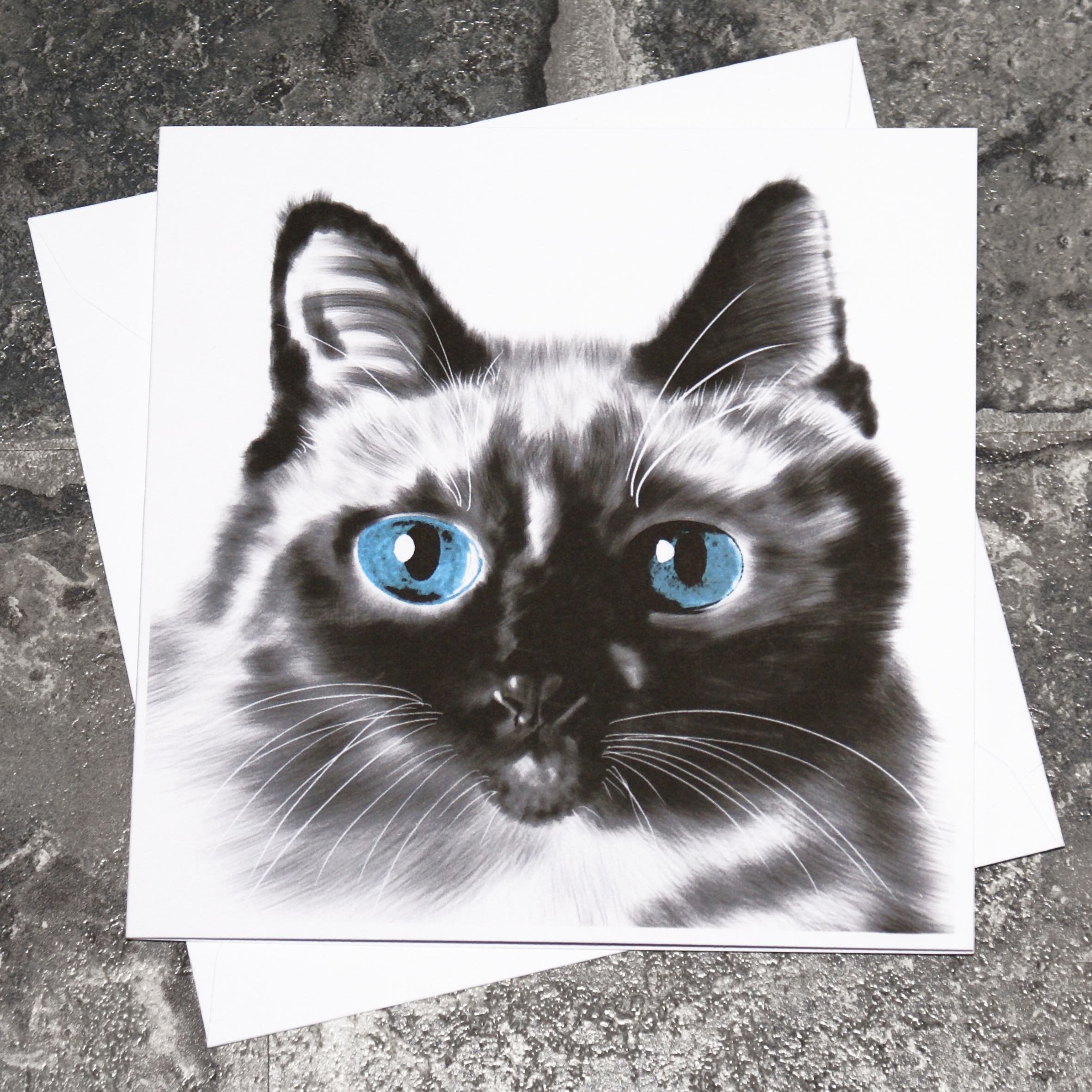 A graphic design of a fluffy cat with brilliantly blue eyes.  Printed from an Original Design, digitally painted by Angie using iPad Pro.