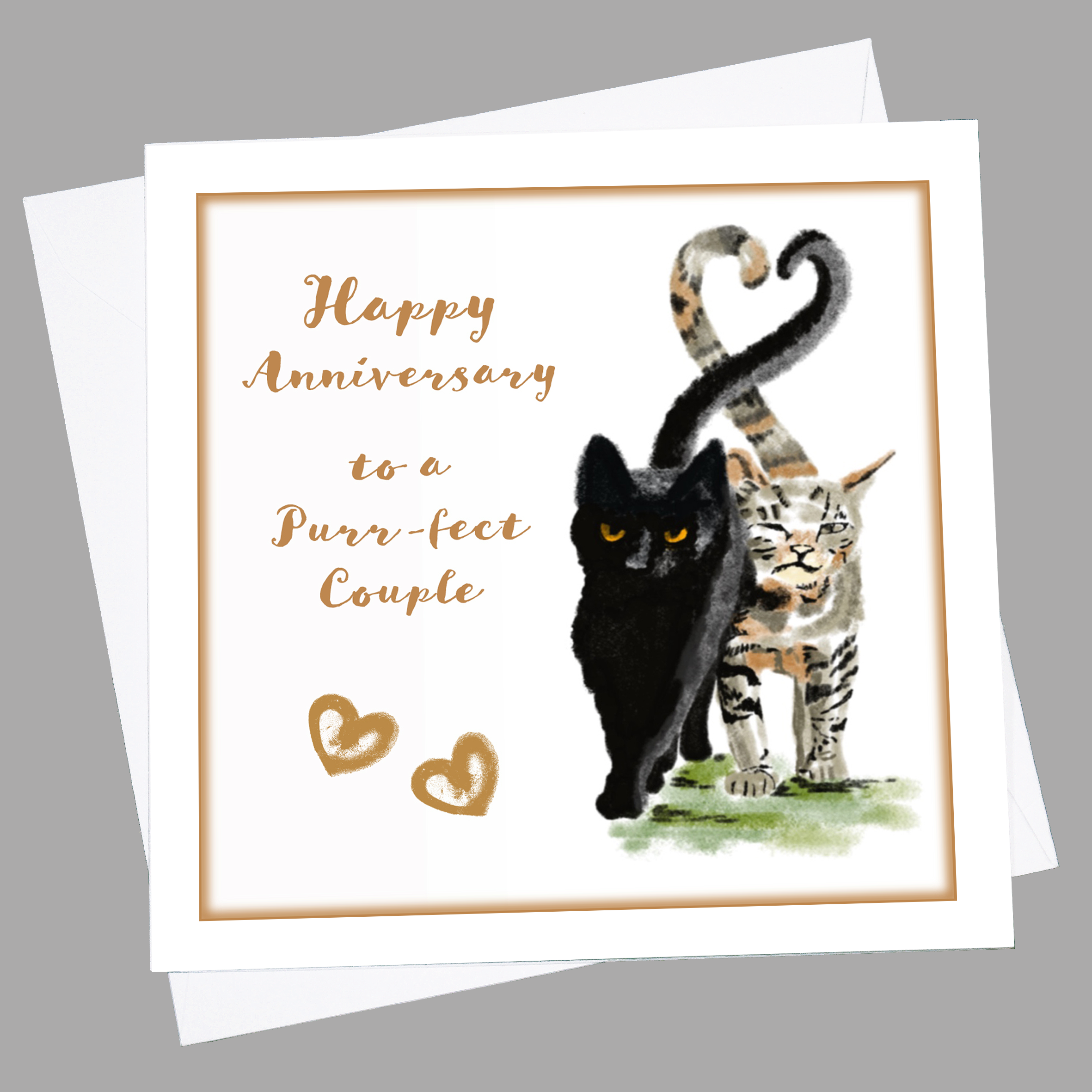 Text on the front reads ‘Happy Anniversary to a Purr-fect Couple’